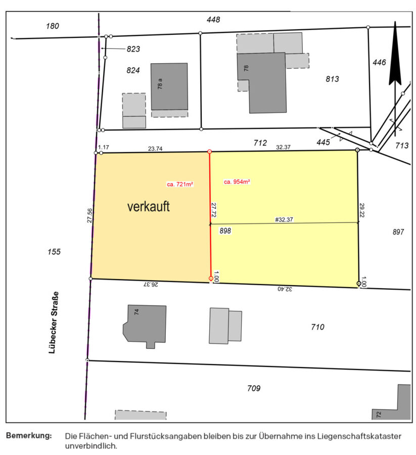Die Vermessung wurde bereits auf Kosten des Verkäufers durchgeführt. Die grundbuchamtliche Realteilung mit Anlegung separater Grundbuchblätter für die neu entstehenden beiden Grundstücke erfolgt in Kürze.